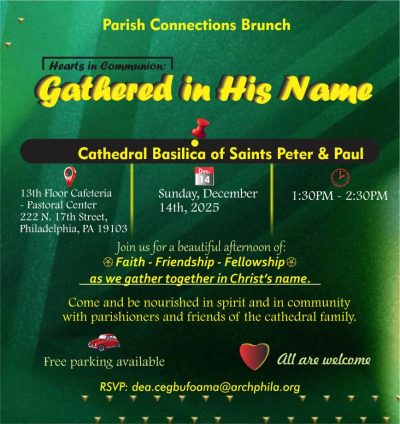 You are cordially invited and encouraged to consider sharing your time, talent and treasure with your Parish and your fellow Parishioners by volunteering for one or more of the parish ministries, committees or groups. Please contact the Parish office at 215-561-1313 for more information.