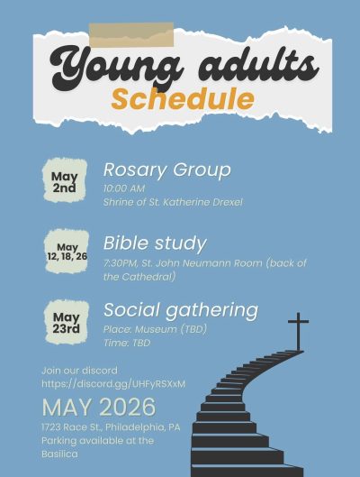 You are cordially invited and encouraged to consider sharing your time, talent and treasure with your Parish and your fellow Parishioners by volunteering for one or more of the parish ministries, committees or groups. Please contact the Parish office at 215-561-1313 for more information.