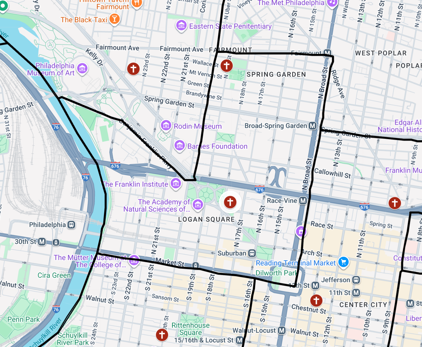 Broad Street from Fairmount Avenue to Market Street; to the Schuylkill River; to the Spring Garden Street Bridge; to the George Washington Monument (entrance to the Parkway); along Parkway to 20th Street; to Fairmount Avenue; to Broad Street. If you are registered in another parish, you must get a letter of permission from the Parish in which you are presently registered before registering with the Cathedral Parish.