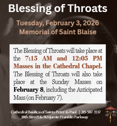 The Blessing of Throats will take place at the 7:15 AM and 12:05 PM Masses in the Cathedral Chapel.
