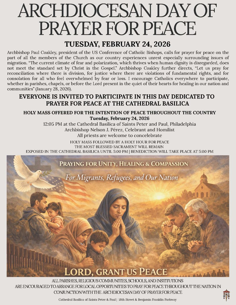Archbishop Paul Coakley, president of the US Conference of Catholic Bishops, calls for prayer for peace on the part of all the members of the Church as our country experiences unrest especially surrounding issues of migration. “The current climate of fear and polarization, which thrives when human dignity is disregarded, does not meet the standard set by Christ in the Gospel.” Archbishop Coakley further directs, “Let us pray for reconciliation where there is division, for justice where there are violations of fundamental rights, and for consolation for all who feel overwhelmed by fear or loss. I encourage Catholics everywhere to participate, whether in parishes, chapels, or before the Lord present in the quiet of their hearts for healing in our nation and communities.” (January 28, 2026)