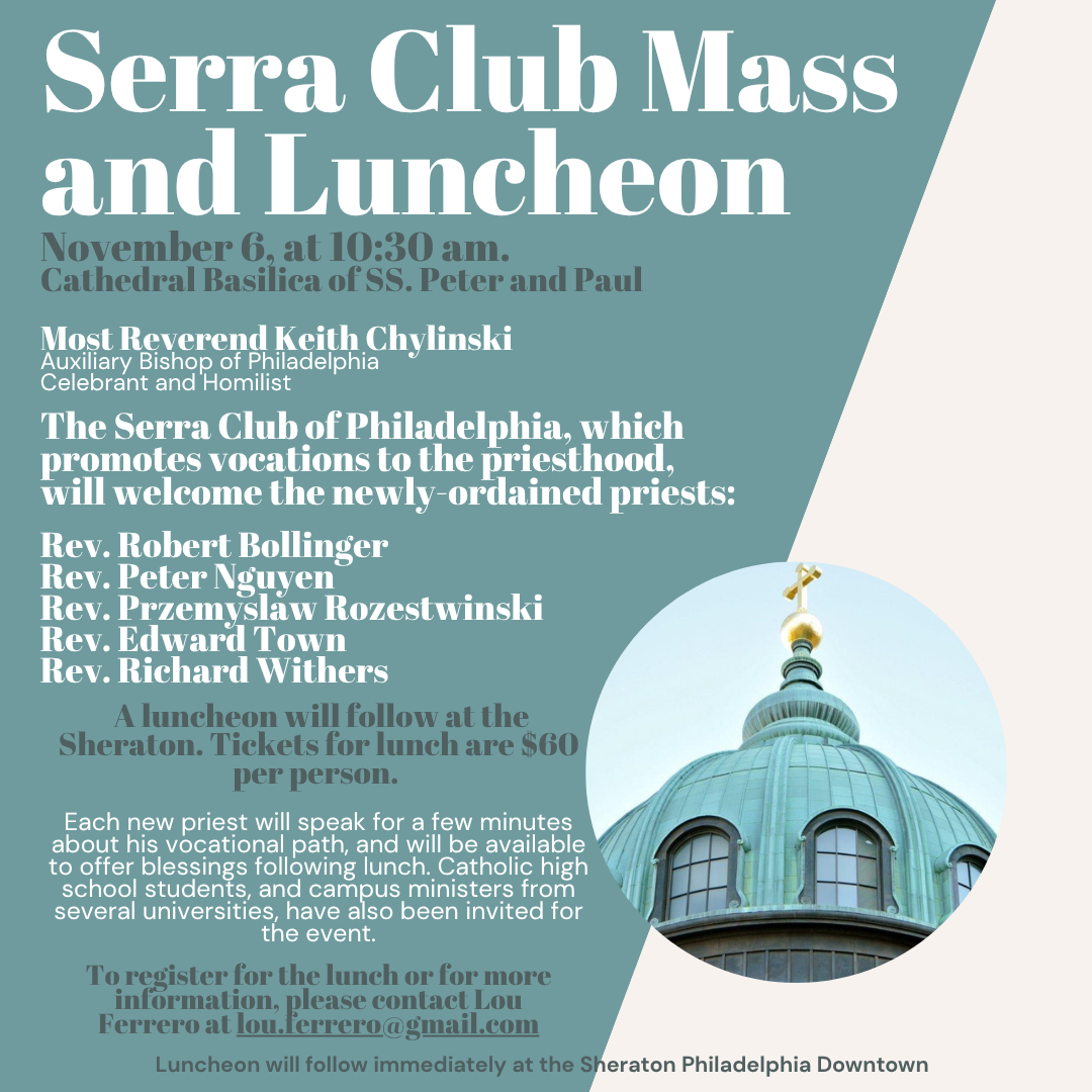 The Serra Club of Philadelphia, which promotes vocations to the priesthood, will welcome the newly-ordained priests of the archdiocese to concelebrate Mass at the Cathedral on Thursday, November 6, at 10:30 am.