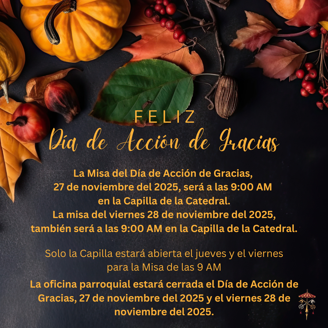 La Santa Misa es celebrada en español los domingos a las 12:30 PM en la capilla de la Catedral.